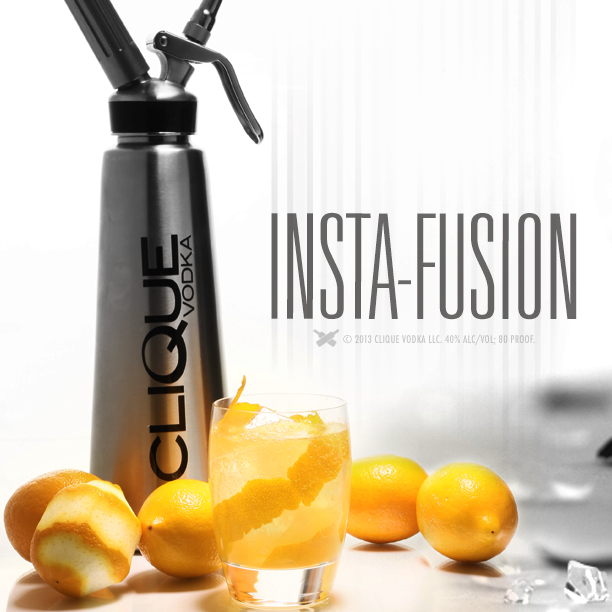 Making infused vodka by steeping it with fruit, vegetables, herbs and spices is a great way to flavor cocktails naturally, but let’s face it- sometimes you just don’t want to wait 4-5 days for Meyer lemon zest to infuse Clique Vodka. The “Insta-fusion” utilizes a much different technique using a cream whipper. By adding pressure to citrus zest in a spirit, the Clique Vodka will be forced into the cells of the Meyer lemon peels for a brief period, causing the lemon oils to flavor it in just a few minutes!