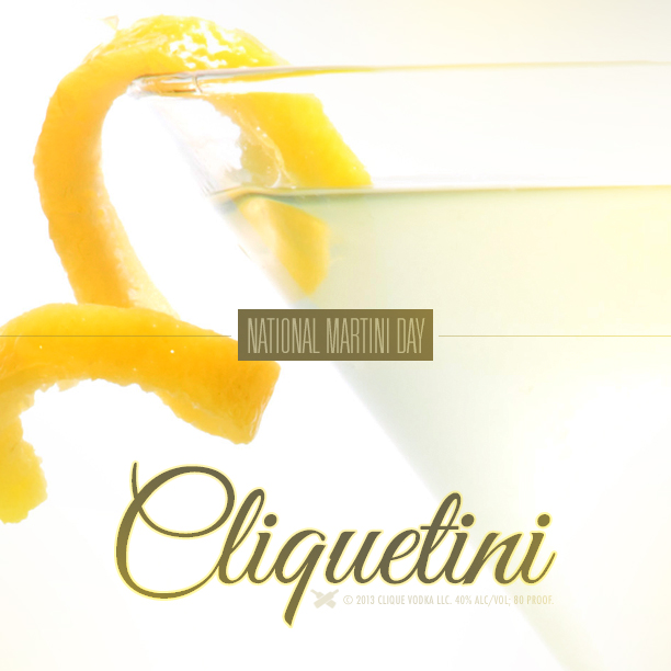 First let’s start with the ingredients: Dry Italian Vermouth, and Clique Vodka. When the martini was first invented, it used whole lot more vermouth then we are used to seeing today- but tastes have changed, and if you order a martini today you’re most likely going to get about 1/4 oz dry Italian vermouth and 2 1/2 oz Vodka, so let’s start with those proportions and add them to a cocktail tin. Add ice and stir until a frost forms on the outside of the tin- usually at least 45 seconds. Strain into a cocktail glass (that’s the proper name for the V-shaped glass martini’s come in), that has been chilled either by sticking it in the freezer for a few minutes, or by filling it with ice and water. Now you have a few choices when it comes to garnishing this delicious cocktail: You can add a twist by twisting a strip of lemon peel over top of the cocktail so the spray of oil falls in, then rub the oily skin of the lemon around the rim and place on the side. If you like olives, you can throw in a spear of them, or even add a bit of olive brine to the recipe to make a “Dirty Martini.” You can also add some cocktail onions to the drink and that would give you a “Gibson.” And if you don’t like vermouth in your cocktail you can always skip it- that would be a straight up martini, or just swirl a bit around the inside of the glass and toss it out before straining the martini in- that would be called an “In & Out.” If you prefer any of these over ice you can make them “On the Rocks,” or you can always shake the cocktail if you prefer, although some don’t like the air bubbles and clout that this causes and call it “bruising the cocktail.” Whichever method or combination of techniques you try, finding your perfect martini is just the way to spend National Martini Day!